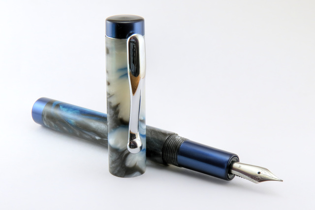 The long, straight sides of this fountain pen are the perfect canvas for the swirly depths of this colorful resin. The royal blue metallic finials and grip are the perfect complement to the swirling black, blue, & white of the barrels.