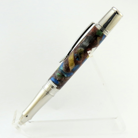 This pen was created using red dyed Curly Maple. Curly Maple has astounding chatoyance, and the dye makes it stand out even more.